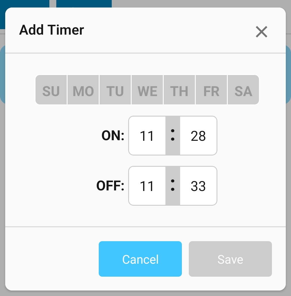 You need to select at least one day of the week, then select at what time the device item will turn ON and OFF. Then press "Save".